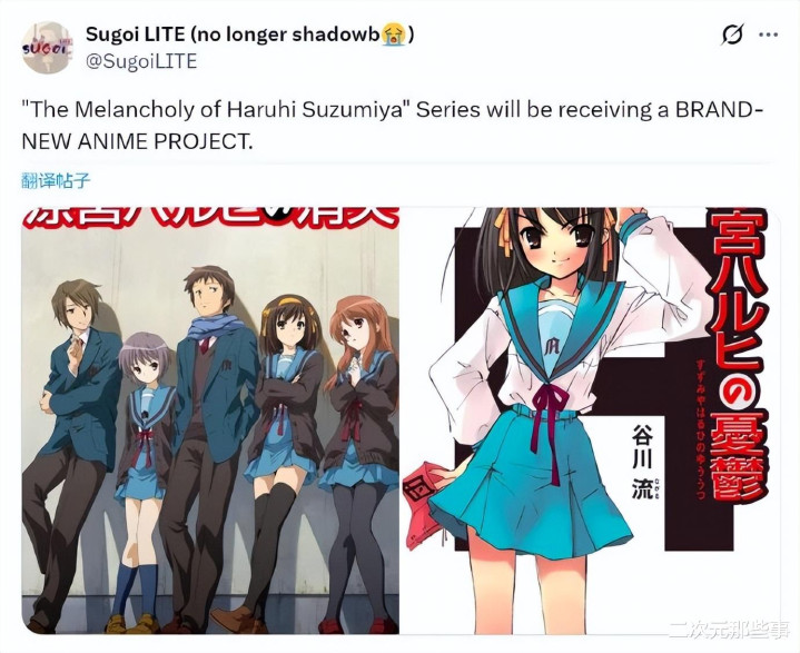 先是《家庭教师》,现在又是《凉宫春日的忧郁》,不是,现在到底是哪一年?看得出现在日本新生代动画有点不给力啊,都开始在老IP身上薅羊毛了。当然,具体《凉宫春日的忧郁》是不是真的要出新作,我们还得等后面官方的消息。